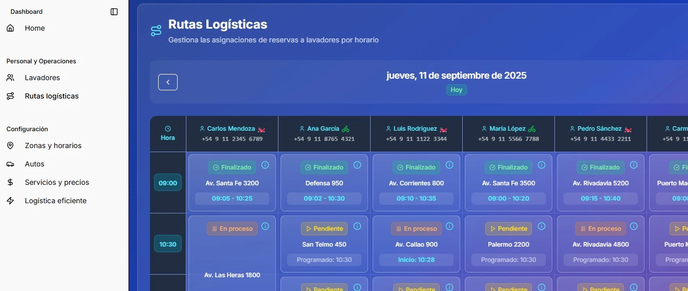 Gestión de turnos y coordinación de rutas logísticas para los lavadores de manera automatizada.